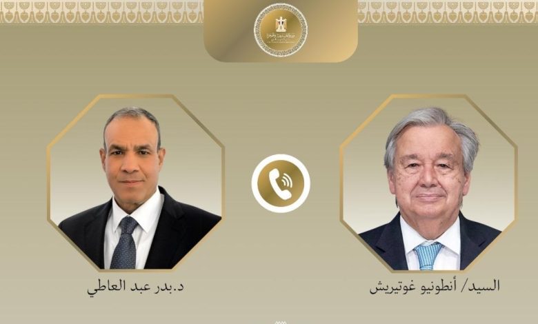 Egyptian Minister of Foreign Affairs and Migration Badr Abdelatty held a phone call on Thursday with United Nations Secretary-General António Guterres, during which they discussed the latest regional developments and a number of issues of mutual concern.