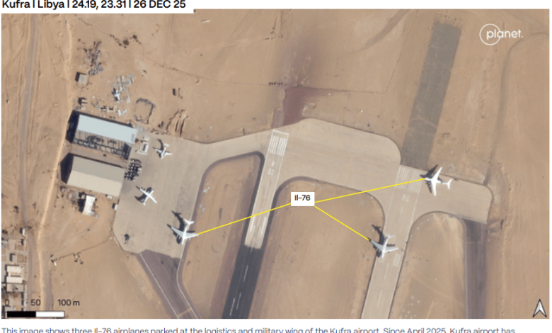 According to the report, Libya is no longer merely a transit route but has become an operational base and a center for assembling and redeploying forces. It pointed to the monitoring of joint military convoys and the transfer of foreign fighters to support the RSF. The report also documented a significant increase in cargo flights to the city of Kufra since April 2025, recording the arrival of 143 Il-76 cargo aircraft over nine months—an average of about 16 aircraft per month.